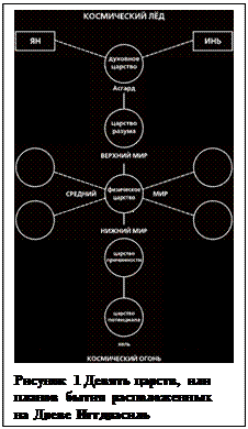 Понятия света и тьмы в древней северной традиции тоже приобрели весьма глубокое значение. Свет наверху был представлен Космическим Огнем, а тьма внизу - Космическим Льдом, который считался "уплотнением" темной энергии. Союз противоположных сил огня и льда, света и тьмы, ян и инь, мужского и женского божественного начал породил мир явлений "в середине всего сущего". Шаман рассматривал все полярные силы во Вселенной как противоположные части одного целого. Поэтому, встречаясь с одной из этих сил, он не забывал о ее двойственной природе. День и ночь, к примеру, рассматривались не как отдельные феномены, но как разные выражения одного и того же явления. Вещество было "плотным" проявлением невидимого духа. Смерть рассматривалась не как прекращение жизни, но как один из ее аспектов: высвобождение из одной формы бытия и переход к другой. Проявление в мире физической реальности также происходит в двух основных аспектах - вещественном и энергетическом, - которые равнозначны и взаимозаменяемы. Энергия содержалась в ткани Вселенной, из которой формировалось вещество, а вещество в конечном счете возвращалось к первичной энергии, из которой оно произошло. Таким образом, Вселенная в древности считалась сознающей, живой, органической и развивающейся Сущностью, которая, как и все остальное, подчинялась законам собственного бытия. Человечество и иные формы жизни рассматривались как часть этого великого целого. В отличие от некоторых мифов о творении, Космос шамана не появился из ничего. Он был проявлением упорядоченной Вселенной, возникшей из первичной субстанции, находившейся в состоянии хаоса. В северной мифологии убийство гиганта Имира и последующее создание Космоса из его тела было аллегорией, сообщающей знание о том, что упорядоченная и развивающаяся Вселенная образовалась из живой субстанции. В ее основе лежала форма снежинки, а структура напоминала дерево с многоярусной кроной. Ствол, или центральная ось, соединял Средний Мир физической реальности с другими мирами. "Наверху" (Верхний Мир) обитали силы знания, просветления и творчества. Это была обитель богов, или более высокоразвитых существ. "Внизу" (Нижний Мир) располагалось царство формирования и зарождения, где обитали менее развитые стихийные духи. Вертикальный ствол, тесно связанный с осознанием живых существ, определял дуализм света и тьмы в сознательной, подсознательной и неосознанной деятельности. Горизонтальный план был связан с энергией и показывал на разделение между экспансивной, электрической энергией Космического Огня и сжимающей, магнетической энергией Космического Льда.