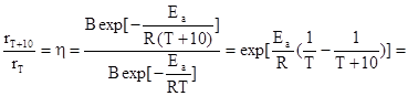Для большинства химических превращений за исключением реакций третьего порядка и ферментативных скорость реакции возрастает с повышением температуры. На качественном уровне представление о масштабе влияния этого фактора на скорость реакции дает эмпирическое правило Вант-Гоффа, согласно которому скорость реакции при повышении температуры на 10K возрастает в 2-4 раза. Если оперировать понятием температурного коэффициента скорости реакции: