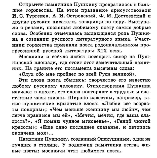 5. В первом предложении определите род, число, падеж каждого существительного. 6. Выпишите из текста словосочетания с качественным, относительным прилагательными (по 1 словосочетанию). 7. Спишите еще раз предложение «Памятник создан скульптором А.М.Опекушиным в 1880 году», записав числительное словами. Охарактеризуйте числительное: разряд, простое или составное. 8. Выпишите из текста словосочетания с местоимениями разных разрядов: личных, относительных, определительных и других. Укажите в скобках разряд, например: газеты того времени (указательное).