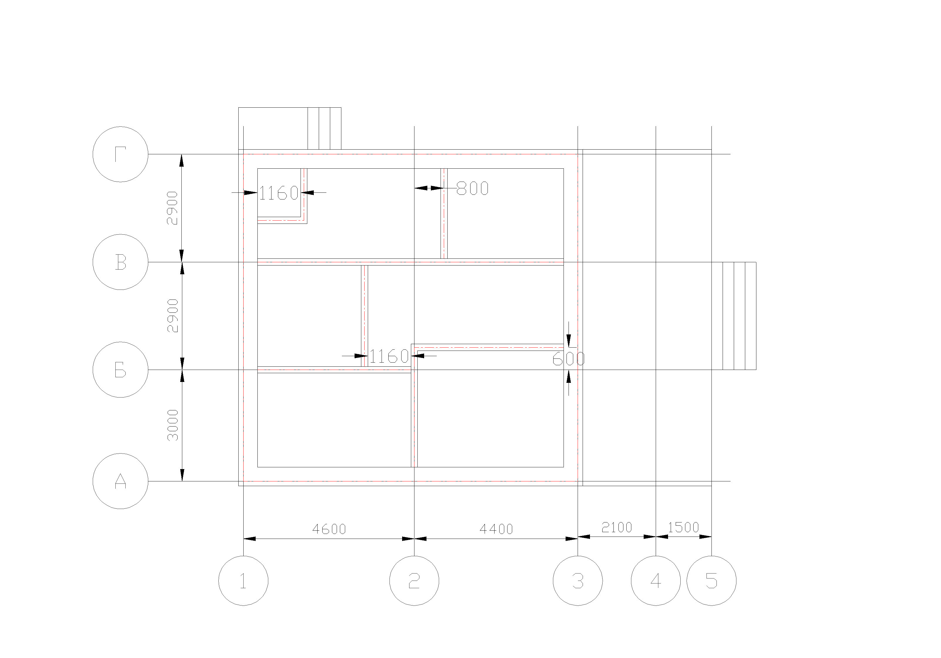 7. Начертите внутренние стены в соответствии с ниже представленным рисунком. Если перегородка не совпадает с координатной осью, то для привязки используйте объектную привязку «Смещение». Эта привязка требует указать базовую точку, относительно которой вы можете сместиться вправо, влево, вверх или вниз. Базовую точку также следует указать с помощью объектной привязки. Это может быть пересечение осей координат, середина стены и т.д.