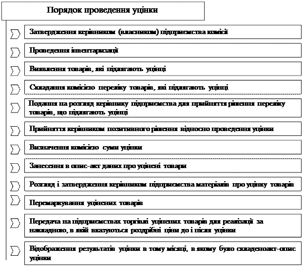 Не підлягають уцінці товари та продукція, оформленні під заставу, що перебувають у резерві або на відповідальному зберіганні. Уцінка товарів проводиться за даними інвентаризації. Порядок проведення уцінки наведений на рис. 3.4. Результати уцінки товарів відображаються в опис-акті уцінки товарів і продукції, що залежалися, та надлишкових товарно-матеріальних цінностей. Розміри уцінки визначаються комісією на підставі експертних оцінок з врахуванням ступеню втрати їх споживчих властивостей, насиченості ринку такими товарами. Раніше уцінені, але не реалізовані товари, можуть уцінюватись повторно до чистої вартості реалізації. Технічно складні товари що мають виробничі паспорти, підлягають уцінці тільки за наявності паспорту і повинні бути справними та придатними до експлуатації. Після уцінки об’єкт господарювання повинен перемаркувати товари, закресливши попередню ціну і позначивши нову ціну на ярликах, етикетах підприємств-виробників, упаковці тощо кожної одиниці товару, і засвідчити їх підписом працівника, відповідального за формування, встановлення або застосування цін.