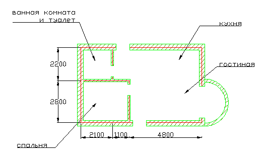1.9. Выполните команду «Обрезать» по линии внешней стены справа. 1.10. Создайте слой – «Штриховка стен» (64 - тёмно-зелёный цвет). Сделайте его текущим и заштрихуйте стены. 1.11. Проставьте размеры осей, используя «цепочку» размеров.