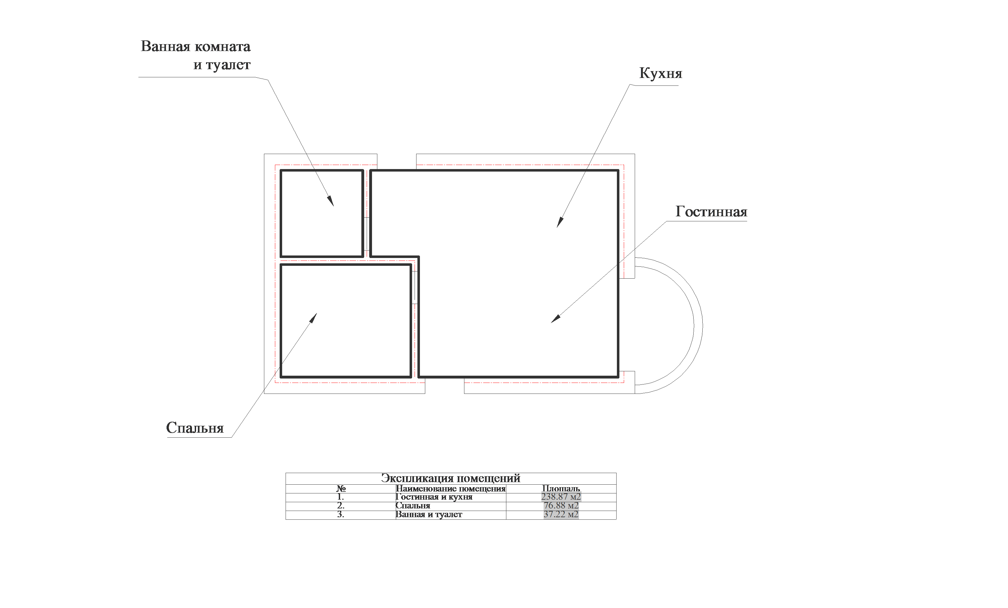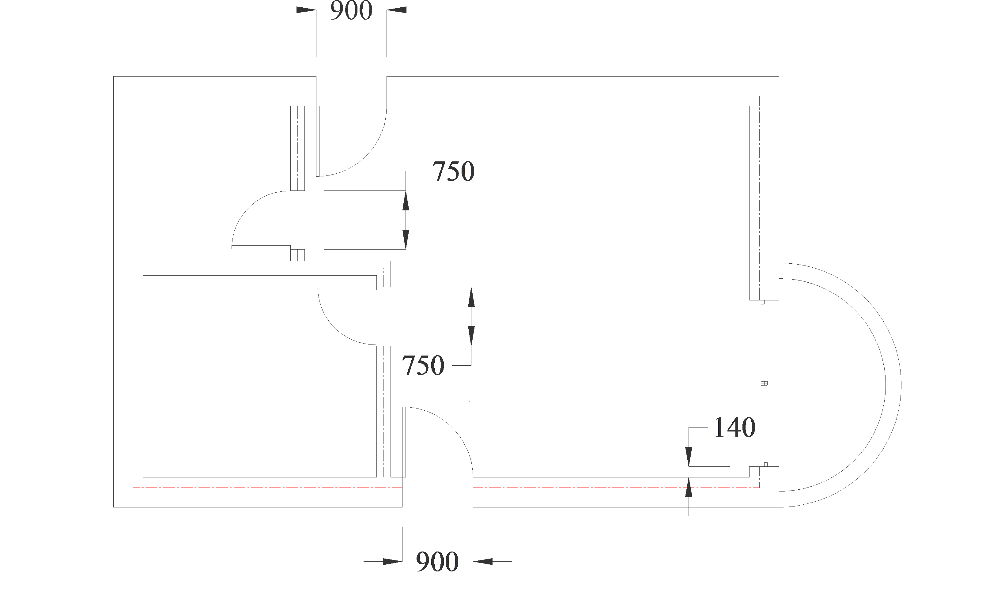 5.3. Блок «Дверь_90» постройте непосредственно в дверном проеме нижней части плана, чтобы не ошибиться в размере. Конструкцию двери смотрите ниже на рисунке (дверное полотно и след от распахнутой двери). Дверное полотно стройте инструментом «Прямоугольник».