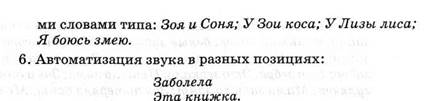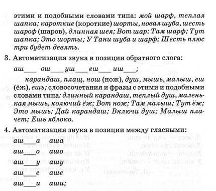 су сэ CU сам, самолет, сабака (собака), сава (сова), санки, соль, сок, солнышко, сумка, суп, семь, серый, синий, сидит, сыр; словосочетания и фразы с этими и подобными словами типа: самолет высоко, маленькие санки, белая соль, синяя сумка, серый волк; Я сам; Самолет летит; Собака лает; Сова кричит — ух-ух; У Оли санки; Дай соль; Я люблю сок; На небе солнышко; У мамы сумка; Я не люблю суп; Мышка любит сыр. 3. Автоматизация звука в позиции обратного слога: нос, автобус, лес, боюсь, умываюсь и т. п.; словосочетания и фразы с этими и подобными словами типа: У нас большой автобус; У нас мяч; Болит нос; Вот лес; Лес далеко; Я умываюсь. 4. Автоматизация звука в позиции между гласными: каса (коса), мяса (мясо), насок (носок), калесо (ко
