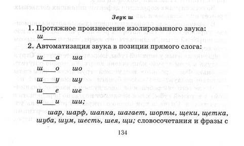 зеркалом показывают, что язык должен сохранять свою форму «чашечкой», рот при этом широко открыт. Когда в ходе упражнений будет получен многовоздушный шипящий звук при направленной вверх воздушной струе, следует сблизить и округлить губы. При лабилизованных губах получается звук ш. Следует отметить, что период подготовительных артикуляционных упражнений, как правило, продолжителен по времени. Если мышца языка недостаточно подготовлена, то после того, как лабиализуются губы, язык может упасть на дно ротовой полости. Иногда, при переводе языка за зубы, его боковые края не образуют смычку с верхними коренными зубами. В этом случае педагог может своими большими пальцами образовать смычку механически, а затем научить этому и ребенка. После того как поставлен и автоматизирован в речи звук ш (обычно в это время ребенок в речи пользуется вызванным звуком ш вместо жищ), следует вызвать и его звонкую пару — звук ж. Наличие голоса при произношении ж и его отсутствие при произнесении ш ребенок может проконтролировать с помощью остаточного слуха. Если предлагаемый способ самоконтроля недостаточен для ребенка, можно прибегнуть к тактильному ощущению вибрации гортани при подключении голоса. Автоматизация звуков шиж.а также работа по их дифференциации проводится на специальном речевом материале. СИСТЕМА УПРАЖНЕНИЙ ПО АВТОМАТИЗАЦИИ ЗВУКОВ В РЕЧИ Даша, Маша, каша, кушает, мешает, решает, слушает, слушай, хорошо, пляшу, пишу, уши, малыши, карандаши, реши, машина, пляшет, пляши; словосочетания и фразы с этими и подобными словами типа: Маша и Даша, любимая каша, длинные уши, цветные карандаши, новая машина; Вот каша; Там машина; Тут малыши; Это карандаши; Малыш кушает кашу; Маша слушает; Маша и Даша пишут; Даша решает пример; Мне мешает Маша; У Даши шапка; У Шуры карандаши. 5. Автоматизация звука в стечении с согласными: шкаф, школа, шла,рубашка, лошка (ложка), кошка, бабушка, дедушка, падушка (подушка), лягушка, мишка, лишний, башня, большой; словосочетания и фразы с этими и подобными словами типа: кошка и мышка, бабушка и дедушка, новая рубашка, большая ложка, большая башня, лишняя картинка, маленький мишка, мягкая подушка, фшкафу (в шкафу), фшколе (в школе); Вот рубашка; Там подушка; Тут дедушка; Это бабушка; Дети идут в школу; Новая рубашка в шкафу; Кош-