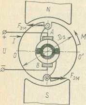 Таким образом, под щеткой А всегда находится пластина, соединенная с проводником, расположенным под северным магнитным полюсом, а под щеткой В — пластина, соединенная с проводником, расположенным под южным полюсом. Благодаря этому полярность щеток генератора остается неизменной независимо от положения витка якоря. Что же касается пульсаций тока во внешней цепи, то они намного ослабляются при увеличении числа витков в обмотке якоря при их равномерном распределении по поверхности якоря и соответствующем увеличении числа пластин в коллекторе. Уже при 16 витках (16 пластин в коллекторе) пульсации тока становятся практически незаметными и ток во внешней цепи генератора можно считать постоянным не только по направлению, но и по значению. В соответствии с принципом обратимости электрических машин упрощенная модель машины постоянного тока может быть использована в качестве двигателя постоянного тока. Для этого необходимо отключить нагрузку генератора R и подвести к щеткам машины напряжение от источника постоянного тока. Например, если к щетке А подключить зажим «плюс», а к щетке В — «минус», то в обмотке якоря появится ток I, направление которого показано на рис. 24.3. В результате взаимодействия этого тока с магнитным полем постоянного магнита (полем возбуждения) появятся