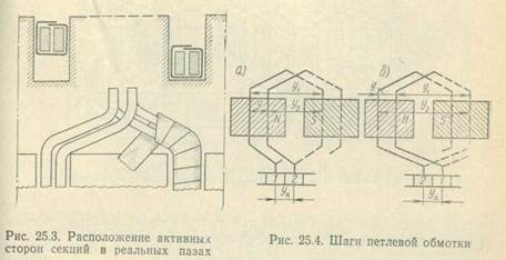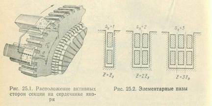 Схемы обмоток якоря делают развернутыми, принтом все секции показывают одновитковыми. В этом случае каждой секции, содержащей две пазовые стороны, соответствует один элементарный паз. Концы секции присоединяют к коллекторным пластинам, при этом к каждой пластине присоединяют начало одной секции и конец другой, т. е. на каждую секцию приходится одна коллекторная пластина. Таким образом, для обмотки якоря справедливо S=Z э = K, где Z э — число элементарных пазов; К — число коллекторных пластин в коллекторе. Число секций, приходящихся на один реальный паз, определяется отношением Z э /Z. Секции, укладываемые в два реальных паза, имеют общую изоляцию (рис. 25.3). В машинах постоянного тока применяют обмотки якоря следующих типов: простая петлевая, сложная петлевая, простая волновая, сложная волновая и комбинированная.