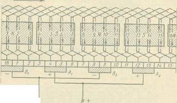 Пример 25.2. Шестиполюсная машина постоянного тока имеет на якоре простую петлевую обмотку из 36 секций. Определить ЭДС и величину тока машины, если в каждой секции наводится ЭДС 10 В, а сечение провода секции рассчитано на ток не более 15 А. Решение. Число параллельных ветвей в обмотке 2 а = 2 р =6, при этом в каждой ветви S п.в= S /(2 а) =36/6=6 секций. Следовательно, ЭДС машины Еа = =6*10=60 В, а допустимый ток машины Ia = 6*15=90 А. Если машина при прочих неизменных условиях имела бы восемь полюсов, то ее ЭДС уменьшилась бы до 40 В, а ток увеличился бы до 120 А. Сложная петлевая обмотка. При необходимости получить петлевую обмотку с большим числом параллельных ветвей, как это требуется, например, в низковольтных машинах постоянного тока, применяют сложную петлевую обмотку. Такая обмотка представляет собой несколько (обычно две) простых петлевых обмоток, уложенных на одном якоре и присоединенных к одному коллектору. Число параллельных ветвей в сложной петлевой обмотке 2а = 2рm, где m — число простых петлевых обмоток, из которых составлена сложная обмотка (обычно m =2). Ширина щеток при сложной петлевой обмотке принимается такой, чтобы каждая щетка одновременно перекрывала m коллекторных пластин, т. е. столько пластин, сколько простых обмоток в сложной. При этом простые обмотки оказываются присоединенными параллельно друг другу. На рис. 25.8 показана развернутая схема сложной петлевой обмотки, состоящей из двух простых (m =2): 2 p =4; Z э=16. Результирующий шаг обмотки по якорю и шаг по коллектору сложной петлевой обмотки принимают равным у=у к =т. Первый частичный шаг по якорю определяют по (25.3). Пример 25.3. Четырехполюсная машина постоянного тока имеет сложную петлевую обмотку якоря из 16 секций. Выполнить развернутую схему этой обмотки, приняв т=2. Решение. Шаги обмотки: у 1 = (Z э/2 p) =16/4 = 4 паза; у= ук = т= 2 паза; y2=y 1— y =4—2=2 паза.