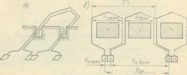 Рис. 25.13. Уравнительные токи в параллельных ветвях простой петлевой обмотки при магнитной несимметрии Отсюда следует, что сложная петлевая обмотка будет симметричной только при т = 2. Уравнительные соединения. Даже при соблюдении всех условий симметрии обмоток. ЭДС параллельных ветвей обмотки якоря в многополюсных машинах могут оказаться неодинаковыми. Причина этого — магнитная несимметрия, из-за нее магнитные потоки одноименных полюсов оказываются неодинаковыми. Происходит это из-за дефектов, возникающих при изготовлении машины: наличия раковин в отливке станины, некачественной сборки полюсов, неправильной центровки якоря, т. е. его перекоса, отчего воздушный зазор под полюсами становится неодинаковым. Влияние магнитной несимметрии на работу машины зависит от типа обмотки якоря. В волновых обмотках секции каждой параллельной ветви равномерно распределены под всеми полюсами машины, поэтому магнитная несимметрия не влечет за собой неравенства ЭДС в параллельных ветвях, так как она одинаково влияет на зсе параллельные ветви обмотки. В петлевых обмотках якоря секции, образующие параллельную ветвь, расположены под смежной парой полюсов. Поэтому при 2р>2 магнитная несимметрия становится причиной неравенства ЭДС параллельных ветвей, что ведет к появлению в обмотке якоря уравнительных токов. Например, при неправильной центровке якоря (рис. 25.13, а) ЭДС первой и четвертой параллельных ветвей становится меньше ЭДС второй и третьей ветвей (зазор под нижним полюсом меньше, чем под верхним). При этом потенциалы щеток В 1 и В 2 оказываются неодинаковыми и в параллельных ветвях обмотки появляются уравнительные токи i yр (рис. 25.13, б). Эти токи замыкаются через шину, соединяющую указанные щетки, и во внешнюю цепь машины не выходят. Следует обратить внимание, что даже при незначительной разности потенциалов u 1 2 между щетками В 1и В 2 ток i ур может оказаться весьма значительным, так как электрическое сопротивление параллельной ветви r п.в невелико. Например, при u 12=2 B и r п.в=0,01 Ом уравнительный ток i yp= = u 12/(2rп.в)=2/(2*0,01) = 100А. Если при этом нагрузочный ток в параллельной ветви i п.в — = 200 А, то токи в параллельных ветвях обмотки становятся неодинаковыми: ia I =ia IV= i п.в— i yp=200—100= 100 A; ia II= i a III= i п.в+ i yp=200+100=300 А. Неравномерная нагрузка параллельных ветвей ведет к перегреву обмотки и увеличению электрических потерь в ней. Перечисленные явления нарушают нормальную работу машины, например перегружаются некоторые щетки (в рассматриваемом случае —щетка В 2), что вызывает интенсивное искрение на коллекторе (см. § 27.3). Для уменьшения неравномерной нагрузки щеток в простых петлевых обмотках поступают следующим образом: точки обмотки якоря, потенциалы которых теоретически должны быть одинаковыми, электрически соединяют между собой. В этом случае возникающие в обмотке уравнительные токи замыкаются внутри обмотки без выхода на щетки. Указанные соединения выполняют медными проводами и называют уравнительными соединениями первого рода (уравнителями). Практически доступными для соединения точками равного потенциала являются концы секций, присоединяемые к коллекторным пластинам, или лобовые части обмотки со стороны, обратной коллектору. Количество точек в обмотке, имеющих одинаковый потенциал, у vp =K / a = К/p. (25.11) Полное число уравнителей первого рода, которое