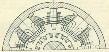 Рис. 26.7. Компенсационная обмотка Компенсационная обмотка. Наиболее эффективным средством подавления влияния реакции якоря по поперечной оси является применение в машине компенсационной обмотки. Эту обмотку укладывают в пазы полюсных наконечников (рис. 26.7) и включают последовательно с обмоткой якоря таким образом, чтобы МДС компенсационной обмотки FK была противоположна по направлению МДС обмотки якоря Fa. Компенсационную обмотку делают распре-ленной по поверхности полюсного наконечника всех главных полюсов машины. При этом линейную нагрузку для компенсационной обмотки принимают равной линейной нагрузке обмотки якоря. Включение компенсационной обмотки последовательно в цепь якоря обеспечивает автоматичность компенсации МДС якоря прилюбой (в пределах номинальной) нагрузке машины. Таким образом, в машине постоянного тока с компенсационной обмоткой при переходе от холостого хода к режиму нагрузки закон распределения магнитной индукции в зазоре главных полюсов остается практически неизменным. Однако в межполюсном пространстве часть МДС якоря остается нескомпенсированной. Нежелательное влияние этой МДС на работу щеточного контакта устраняют применением в машине добавочных полюсов (см. § 27.3). Компенсационные обмотки применяют лишь в машинах средней и большой мощности — более 150—500 кВт при U >440 В, работающих с резкими колебаниями нагрузки, например в двигателях для прокатных станов. Объясняется это тем, что компенсационная обмотка удорожает и усложняет машину и ее применение в некоторых машинах экономически не оправдывается. Увеличение воздушного зазора под главными полюсами. В машинах малой и средней мощности, не имеющих компенсационной обмотки, вредное влияние реакции якоря по поперечной оси ослабляют соответствующим выбором воздушного зазора под главными полюсами. При этом следует иметь в виду, что при достаточно малом воздушном зазоре и значительной линейной нагрузке реакция якоря по поперечной оси может не только ослабить магнитное поле под одной из частей главного полюса, но и перемагнитить его, т. е. изменить полярность — «опрокинуть поле». Некоторое увеличение воздушного зазора под главными полюсами, особенно на их краях, значительно ослабляет действие реакции якоря. Однако не следует забывать, что увеличение воздушного зазора ведет к необходимости повышения МДС обмотки главных полюсов, а следовательно, и к увеличению размеров полюсных катушек, полюсов и габаритов машины в целом. На этом же принципе уменьшения МДС поперечной реакции якоря за счет повышенного магнитного сопротивления на пути ее действия основан и другой способ ослабления действия реакции якоря. Этот способ состоит в том, что сердечники главных полюсов делают из листовой анизотропной (холоднокатаной) стали (обычно применяют сталь марки 3411). Эта сталь в направлении проката обладает повышенной магнитной проницаемостью, а «поперек проката»— небольшой магнитной проницаемостью. Штамповать пластины полюсов из такой стали следует так, чтобы ось полюса совпадала с направлением проката листа стали. Date: 2015-07-24; view: 1658; Нарушение авторских прав |