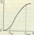 достигает значения, при котором зависимость I в r в = = f (I в) становится касательной к прямолинейной части характеристики х.х. (прямая 3). В этих условиях генератор не самовозбуждается. Сопротивление цепи возбуждения, при которой прекращается самовозбуждение генератора, называют критическим сопротивлением (r в.крит). Следует отметить, что самовозбуждение генератора возможно лишь при частоте вращения, превышающей критическую n кр. Это условие вытекает из характеристики самовозбуждения генератора (рис. 28.6), представляющей собой зависимость напряжения генератора в режиме х.х. от частоты вращения при неизменном сопротивлении цепи возбуждения, т. е. U0=f(n) при r в = const. Таким образом, самовозбуждение генераторов постоянного тока возможно при соблюдении следующих условий: a) магнитная система машины должна обладать остаточным магнетизмом; б) присоединение обмотки возбуждения должно быть таким, чтобы МДС этой обмотки совпадала по направлению с потоком остаточного магнетизма Фост; в) сопротивление цепи возбуждения должно быть меньше критического; г) частота вращения якоря должна быть больше критической. Так как генератор параллельного возбуждения самовозбуждается лишь в одном направлении, то и характеристика х.х. этого генератора может быть снята только для одного квадранта осей координат. Нагрузочная и регулировочная характеристики генератора параллельного возбуждения практически не отличаются от соответствующих характеристик генератора независимого возбуждения. Внешняя характеристика генератора параллельного возбуждения 1 (рис. 28.7) менее жесткая, чем у генератора независимого возбуждения. Объясняется это тем, что в генераторе параллельного возбуждения помимо причин, вызывающих уменьшение напряжения в генераторе независимого возбуждения (реакция якоря и падение напряжения в цепи якоря), действует еще и третья причина — уменьшение тока возбуждения, вызванное снижением напряжения от действия первых двух причин. Этим же объясняется и то, что при постепенном уменьшении сопротивления нагрузки r н ток увеличивается лишь до критического значения I кр, а затем при дальнейшем уменьшении сопротивления нагрузки ток начинает уменьшаться. Наконец, ток нагрузки при коротком замыкании I к< I кр. Дело в том, что с увеличением тока усиливается размагничивание генератора (усиление реакции якоря и уменьшение тока возбуждения) и машина переходит в ненасыщенное состояние, при котором даже небольшое уменьшение сопротивления нагрузки вызывает резкое уменьшение ЭДС машины (см. рис. 28.5, б).Так как ток определяется напряжением на выводах генератора U и сопротивлением нагрузки r н, т. е. I=U/r н, то при токах нагрузки I < I кр, когда напряжение генератора уменьшается медленнее, чем убывает сопротивление нагрузки, происходит рост тока нагрузки. После того как I = I кр, дальнейшее уменьшение r н сопровождается уменьшением тока нагрузки, так как в этом случае напряжение U убывает быстрее, чем уменьшается сопротивление нагрузки r н. Таким образом, ч. з., вызванное постепенным уменьшением сопротивления нагрузки, не опасно для генератора параллельного возбуждения. Но при внезапном к. з. магнитная система генератора не успевает размагнититься и ток I к достигает опасных для машины значений I к= (8-12) I ном (кривая 2). При таком резком возрастании тока нагрузки на валу