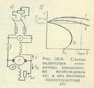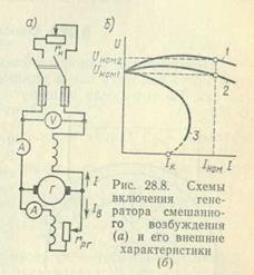Генератор смешанного возбуждения (рис. 28.8, а) имеет параллельную и последовательную обмотки возбуждения. Поток возбуждения создается в основном параллельной обмоткой. Последовательная обмотка обычно включается согласно с параллельной (чтобы МДС обмоток складывались), что обеспечивает получение жесткой внешней характеристики генератора