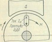 Электрические машины обладают свойством обратимости, т. е. они могут работать как в режиме генератора, так и в режиме двигателя. Поэтому если машину постоянного тока подключить к источнику энергии постоянного тока, то в обмотке возбуждения и в обмотке якоря машины появятся токи. Взаимодействие тока якоря с полем возбуждения создает на якоре электромагнитный момент М, который является не тормозящим, как это имело место в генераторе, а вращающим. Под действием электромагнитного момента якоря машина начнет вращаться, т. е. машина будет работать в режиме двигателя, потребляя из сети электрическую энергию и преобразуя ее в механическую. В процессе работы двигате- ля его якорь вращается в магнитном поле. В обмотке якоря индуцируется ЭДС Еа, направление которой можно определить по правилу «правой руки». По своей природе она не отличается от ЭДС, наводимой в обмотке якоря генератора. В двигателе же ЭДС направлена против тока I а и поэтому ее называют противоэлектро-движущей силой (противо-ЭДС) якоря (рис. 29.1). Для двигателя, работающего с постоянной частотой вращения,