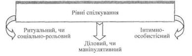 Глава 1. Процес спілкування та його складові у рольове спілкування вводяться характеристики особистостей людей, що спілкуються, — носіїв певних ролей. Отже, ми можемо диференціювати формальне і неформальне спілкування. На відміну від формального неформальне спілкування характеризується тим, що в ньому набагато важливішими є моменти, пов'язані з особистісними змістами, а не з передачею тих чи інших значень, закріплених у мовній формі. Характер цілі і психологічна дистанція, що виникає між партнерами, дозволяє охарактеризувати різні рівні спілкування:
