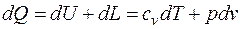 Уравнение первого закона термодинамики Уравнением первого закона термодинамики пользуются для определения параметров состояния газа при осуществлении термодинамического процесса. Оно является частным выражением закона сохранения энергии для элементарного объема газа, написанным в системе координат, движущейся вместе с рассматриваемым элементом объема или, в частном случае, для покоящегося газа. Для элементарного объема газа уравнение первого закона термодинамики имеет вид: