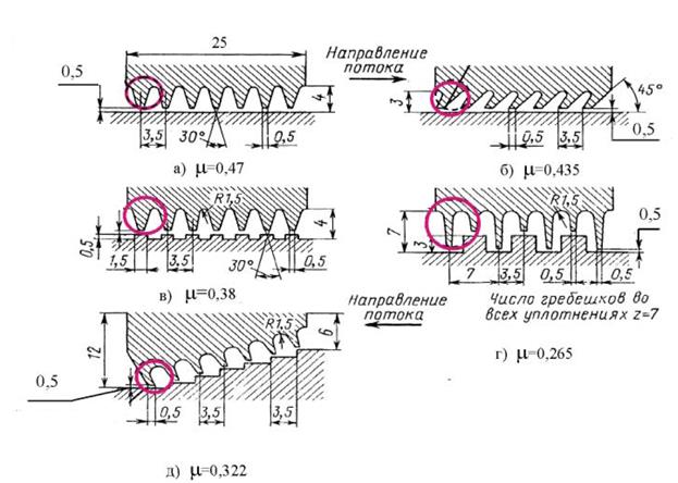 Существуют разные виды лабиринтных уплотнений (см. рис. 18.5). Самое простое, но наименее эффективное из всех лабиринтных уплотнений - прямоточное (см. рис. 18.5 а). Расположение гребешков под углом к потоку несколько повышает его эффективность (см. рис. 18.5 б). При расположении гребешков на поверхности с уступами или наклонной поверхности к эффекту полезных потерь при дросселировании гребешками, добавляются потери от изменения направления потока, что способствует уменьшению утечек (см. Рис. 18.5 д) и т.д.