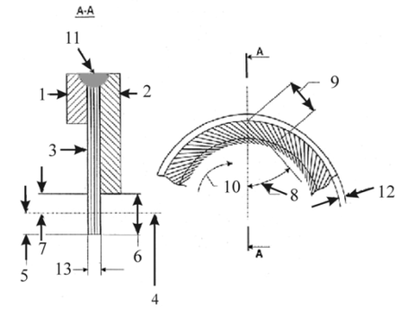 Рис. 18.7. Схема щеточного уплотнения: 1 — передняя пластина; 2 — задняя пластина; 3 — пакет проволочных щетинок; 5 — перекрытие щетинок (радиальное); 6 — выступание щетинок (радиальное); 7—зазор «8» по задней пластине; 8 — угол расположения щетинок в свободном состоянии; 9 — свободная длина щетинок; 10 — направление вращения ротора; 11 — сварка; 12 — радиальная высота передней пластины 1; 13 — толщина пакета щетинок