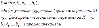 В регрессионном анализе рассматриваются односторонняя зависимость случайной переменной Y от одной (или нескольких) неслучайной независимой переменной X. Такая зависимость может возникнуть, например, в случае, когда при каждом фиксированном значении X соответствующие значения Y подвержены случайному разбросу за счет действия ряда неконтролируемых факторов. Такая зависимость Y от X называется регрессионной и ее также можно представить в виде (1). При этом зависимую переменную Y называют также функцией отклика, объясняемой, выходной, результирующей, эндогенной переменной, результативным признаком, а независимую переменную X – объясняющей, входной, предсказывающей, предикторной, экзогенной переменной, фактором, регрессором, факторным признаком. Уравнение (1) называется модельным уравнением регрессии (или просто уравнением регрессии), а функция j(x) – модельной функцией регрессии (или просто функцией регрессии), а ее график – линией регрессии. Для точного описания уравнения регрессии необходимо знать условный закон распределения зависимой переменной Y при условии, что переменная X примет значение x, т.е. X=x. На практике такую информацию получить, как правило, не удается, так как обычно исследователь располагает лишь выборкой пар значений (xi, yi) ограниченного объема n. В этом случае речь может идти об оценке (приближенном выражении, аппроксимации) по выборке функции регрессии. Такой оценкой является выборочная линия (кривая) регрессии: