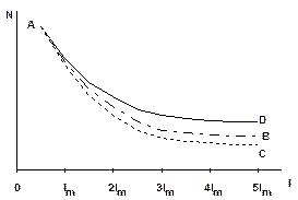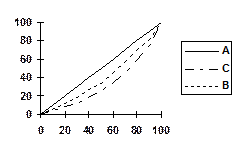 Рис. 1. Кривые Лоренца 1 группа имеет 15% дохода, 2 группа - 18%, 3 группа - 20%, 4 группа - 22% и 5 группа - 25%. Кривая С отвечает еще более неравномерному распределению доходов. 1 группа получает 10%, 2 группа 15%, 3 группа 18%, 4 группа 20%, 5 группа 37%. Модель распределения доходов, принадлежащая В.Парето, также предназначена для анализа характера неравномерности доходов в обществе. Она строится следующим образом: Обозначим через Im - наименьший доход, который может получать семья в данном обществе. Тогда для характеристики относительного числа семей (в процентах) N(I), получающих доход не менее, чем I, может быть использовано соотношение: