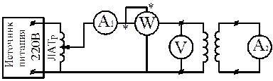 При активно-индуктивном характере сопротивления потребителя с ростом нагрузки трансформатора падение напряжения на его обмотках будет увеличиваться. Следовательно, величина напряжения на вторичной обмотке U2 будет уменьшаться, т.к. U1 =const. Кривая зависимости напряжения U2 на зажимах вторичной обмотки от тока I2 вторичной цепи при неизменном номинальной частоте f и при неизменном коэффициенте мощности cos φ2 нагрузки получила название внешней характеристики трансформатора. Снятие внешней характеристики для активной нагрузки проводится по схеме, изображенной на рисунке 8.