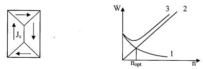 Так как намагничивание может быть у образца разным, то условились сравнивать различные ферромагнетики по коэффициенту магнитострикции, измеряя этот коэффициент в состоянии насыщения (λs). Коэффициент магнитострикции может быть положительным и отрицательным. При намагничивании многодоменного ферромагнетика происходит перемагничивание каждого домена, поэтому каждый домен изменяет свои размеры поразному и внутри материала создаются внутренние напряжения, которые следует преодолеть в процессе намагничивания. На это требуется затратить некоторую энергию, которая называется энергией магнитострикции насыщения (Wλ). Магнитостатическая энергия (Wo) представляет собой энергию, запасенную во внешнем магнитном поле домена. С уменьшением размера домена, уменьшается величина Js2 и, следовательно -Wo. Энергия магнитного взаимодействия Wм определяет энергию взаимодействия внешнего намагничивающего поля (Н) и поля домена Js. Формула для расчета этой энергии напоминает формулу для энергии обменного взаимодействия