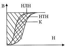 Рисунок 10 Рисунок 11 По мере увеличения тока растет индукция в образце по кривой 0a. Индукция в точке а называется индукцией насыщения (Bs). Это самая большая индукция, которая может быть получена у данного вещества. Если продолжать намагничивание, то индукция будет расти в данном объеме пространства и выше точки а, пропорционально увеличению напряженности намагничивающего поля, однако, образец ферромагнетика на величину этой индукции уже не будет оказывать никакого влияния, а рост индукции будет пропорционален росту напряженности намагничивающего поля с коэффициентом пропорциональности µo. Если размагничивать образец ферромагнетика после того как его намагнитили до насыщения и выше, то до точки a размагничивание будет происходить по той же кривой, что и намагничивание, а начиная с точки а, кривая размагничивания (кривая аb) не будет совпадать с кривой намагничивания. Если уменьшить намагничивающий ток до нуля, после намагничивания образца до насыщения, то попадем в точку b. Можно изменить направление намагничивающего тока и начать намагничивание в противоположном направлении. В результате достигнем точки c, а затем d, при этом образец окажется перемагничен до насыщения в противоположном направлении по сравнению с точкой а. Наконец, меняя еще раз направление тока можно опять вернуться в точку а, замкнув кривую аbcdef, которая называется предельным гистерезисным циклом. Таким образом, в процессе перемагничивания образца получают две кривые: основную кривую намагничивания 0a и предельный гистерезисный цикл аbcdef. По этим двум кривым можно определить несколько важных магнитных характеристик ферромагнетика. Первая - индукция насыщения (Bs) (см. выше). Вторая характеристика представляет собой индукцию остаточную (Br). Это индукция, которая остается в предварительно намагниченном до насыщения замкнутом кольцевом образце при уменьшении напряженности намагничивающего поля до нуля. Третья характеристика - коэрцитивная сила Нc. Коэрцитивной силой называют напряженность намагничивающего поля, взятую с обратным знаком, которую надо приложить к предварительно намагниченному до насыщения замкнутому кольцевому образцу, чтобы уменьшить индукцию в образце до нуля. По основной кривой намагничивания можно определить относительную магнитную проницаемость