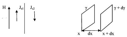 На рисунке 14 показана стенка между доменами при своем движении. Пусть стенка в положении X имеет определенный запас поверхностной удельной энергии стенки γ. Если она передвинется на некоторую величину, то произойдет и изменение поверхностной энергии стенки (γ + dγ), так как энергия стенки зависит от ее положения в ферромагнетике. Выигрыш равен энергии намагничивания части объема второго домена в результате движения стенки, а проигрыш, который уравновешивает этот выигрыш, равен суммарной изменившейся энергии стенки