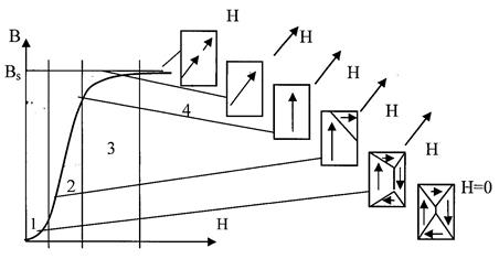 Рисунок 16 - Основная кривая намагничивания и изменение доменной структуры ферромагнетика при изменении напряженности магнитного поля