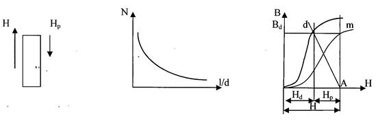 Коэффициент пропорциональности N называют коэффициентом размагничивания. Он зависит от формы образца. Чем длиннее стержень, тем дальше полюса магнита разнесены в пространстве, тем меньше коэффициент размагничивания (рисунок 18), и наоборот. Таким образом: разомкнутый ферромагнитный образец в магнитном поле находится одновременно под действием двух полей: внешнего поля Н и размагничивающего поля полюсов Hp, которые направлены навстречу друг другу. Для того чтобы определить действительное магнитное состояние такого образца, возьмем основную кривую намагничивания для материала, из которого изготовлен такой образец и которая получена для замкнутого кольцевого образца (рисунок 19). Отложим напряженность намагничивающего поля Н, при этом, если бы образец был кольцевым, то для определения индукции достаточно восстановить перпендикуляр из точки А. Для разомкнутого образца надо еще отложить из точки А размагничивающее поле полюсов и только потом восстановить перпендикуляр. Координата точки d и определит действительную индукцию в образце Bd. Затруднение заключается в том, что неизвестна напряженность размагничивающего поля полюсов. Построим прямоугольный треугольник Adm.