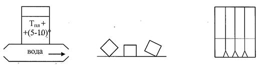 Рисунок 36 Рисунок 37 Для хрупких материалов используют еще один способ создания текстуры - направленную кристаллизацию. На рисунке 38 показана установка для направленной кристаллизации. Она состоит из тигля (огнеупорного стакана, в котором содержится расплавленный металл) и нагревательной электрической печи. Дно тигля полое и может охлаждаться водой. Процесс кристаллизации начинается от дна тигля. При этом тигель опускается, выходя из нагревательной печи, поэтому фронт кристаллизации перемещается от дна тигля к поверхности металла. Кристаллизация заканчивается, когда фронт кристаллизации достигает поверхности. На рисунке 39 показан начальный этап кристаллизации, когда появились только первые кристаллы. Они ориентированы произвольно относительно нормали к фронту кристаллизации. Скорость роста кристаллов анизотропна, как и любое другое свойство. Поэтому быстрее растут благоприятно ориентированные зародыши. Причем это направление совпадает и с направлением легкого намагничивания. Когда кристаллизация заканчивается, нижнюю часть слитка отрезают, а оставшуюся часть, состоящую из столбчатых кристаллов, используют как текстурованный ферромагнетик (рисунок 40).
