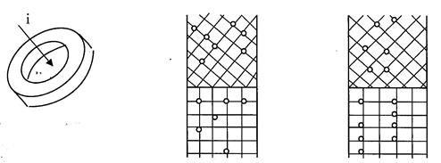 Рисунок 38 Рисунок 39 Рисунок 40 Есть еще один способ создания текстуры - термомагнитная обработка. Делается эта обработка сразу на готовых магнитопроводах (рисунок 41). Обработке подвергаются только сплавы, состоящие из двух сортов атомов - магнитоактивных (с отличным от нуля магнитным моментом) и немагнитоактивных. К тому же материал должен иметь высокую точку Кюри. Обработка происходит таким образом: готовые сердечники устанавливают в приспособление, помещают в печь, нагревают до температуры несколько выше точки Кюри, включают магнитное поле и начинают медленно охлаждать. До включения поля магнитоактивные атомы располагались в кристаллической решетке совершенно хаотично (рисунок 42). Когда сердечник будет находиться при температуре ниже точки Кюри, под действием намагничивающего поля магнитоактивные атомы расположатся вдоль магнитных силовых линий, образуя цепочки атомов (рисунок 43).