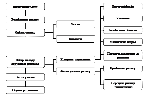 Етап визначення мети являє собою формулювання мети, керуючись якою визначають ступінь прийнятності ризику. Для людини ця мета може включати турботу про своє здоров'я, підтримку певного матеріального рівня сім'ї, побудову кар'єри і т.п. Для підприємницької структури головною метою є забезпечення стійкого існування фірми в невизначених обставинах. Етап розпізнання ризику виражається в усвідомленні можливих ризикових ситуацій підприємцем чи індивідом. Етап оцінки ризику полягає у визначенні ступеня його серйозності і небезпеки. Розрізняють два види оцінок ризику – якісну і кількісну. На етапі вибору методів керування ризиком самі методи поділяються на дві категорії – контроль за ризиком і фінансування ризику. Рішення про те, який з методів керування ризиком вибрати, приймає особа, відповідальна за прийняття рішень. Іноді виявляється, що найкращим рішенням може бути поєднання одразу кількох методів. Етап застосування обраного методу (або методів) – рішення про те, який з методів керування ризиками слід застосовувати. Часто виявляється, що дієвою є сукупність різних методів. Етап оцінки результатів - це підбиття підсумків за певний період діяльності в умовах ризику. 1.2 Контроль за ризиком Контроль за ризиком інакше називається методом мінімізації збитків [1] і може здійснюватися такими способами: · За допомогою диверсифікації. Диверсифікацією називається інвестування у більш ніж один вид активів. Диверсифікація у підприємництві полягає у розподілі зусиль і капіталовкладень між різними видами діяльності. У теорії ймовірності легко доводиться, що ймовірність одночасного настання відразу всіх чи кількох несприятливих подій значно менша, ніж кожної з них окремо. Саме на основі цього висновку і будується диверсифікація. Наприклад, створення портфеля цінних паперів, що мінімізує ризик вкладення грошей, виробництво диверсифікованого набору товарів. Вкладаючи гроші у кілька банків, керуються тим, що ймовірність їх одночасного розорення набагато нижча, ніж кожного з них. По своїй суті диверсифікованість – це „розпорошення” ризику за принципом: „не клади яйця в один кошик” чи „не тримай гроші в одній кишені”. Диверсифікація може здійснюватися в часі й у просторі. Розрізняють також концентричну і горизонтальну диверсифікації. Концентрична диверсифікація належить до вже освоєних видів діяльності, горизонтальна - до нових. Так, поповнення асортименту виробами, подібними до товарів, які вже виробляються підприємством, є концентричною диверсифікацією. Освоєння ж випуску виробів, несхожих на товари, які підприємство вже виробляє, є горизонтальною диверсифікацією. До будь-якого методу керування ризиком варто підходити творчо і виважено, у тому числі й до диверсифікації. Застосовуючи диверсифікацію, слід враховувати: - Диверсифікація може не тільки зменшити, а й збільшити ризик. Це може спостерігатися в тому випадку, якщо нові сфери діяльності невідомі для особи, приймаючої рішення (ОПР) чи в яких її професійні знання обмежені. - Не кожний ризик можна зменшити за допомогою диверсифікації. Такі ризики, як ризики, пов'язані з очікуванням кризи чи піднесення економіки; ризики, пов'язані з рухом банківського відсотка; політичний ризик і ряд інших не піддаються диверсифікації. · Способом ухиляння від ризику, тобто відмови від 
