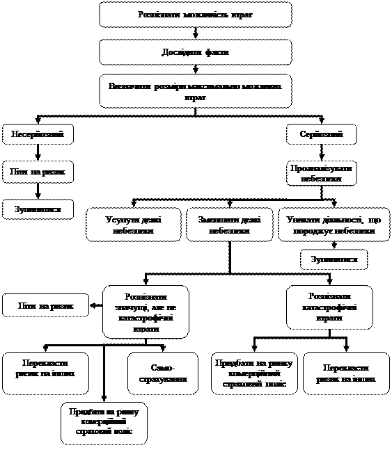 Важливо відзначити, що нерівність (1.7) визначає максимально прийнятний для страхувальника розмір страхової премії виходячи з внутрішніх властивостей страхових ризиків, що описуються в моделі параметрами Lмах. і Lсередн Ці параметри можуть бути визначені на основі статистичних даних. У разі їх відсутності як наближені значення Lмах. і Lсередн можна використовувати доступні дані щодо інших підприємств аналогічного профілю, або взяти значення максимального і середнього річного збитку від розглянутих ризиків за досить тривалий період часу (у приведених до рівня розрахункового року сумах), скориговані на коефіцієнт, визначений експертним шляхом. На основі аналізу нерівності (1.7) можна зробити такі, власне кажучи, очевидні, висновки про вплив різних умов на використання страхування на підприємстві: 1. Чим більший розмір фонду ризику, що формується підприємством, тим менш ефективним є самострахування. 2. Ефективність самострахування падає зі збільшенням прибутковості діяльності підприємства і зростає зі збільшенням прибутковості надійних високоліквідних інвестицій. Це положення має очевидний економічний зміст: зі збільшенням прибутковості своєї діяльності підприємству вигідніше вкладати кошти у виробництво, ніж використовувати їх на створення фонду ризику. З іншого боку, зростання прибутковості цінних паперів підвищує привабливість вкладення в них тимчасово вільних коштів фонду. 1.5 Особливості керування ризиками фірми Роботу з ризик-менеджменту на фірмі рекомендується здійснювати за допомогою спеціально розробленої програми керування ризиками. Для розробки такої програми і контролю за її виконанням в ідеалі має бути створений спеціальний підрозділ, очолюваний ризик-менджером. У віданні ризик-менеджера мають бути всі питання щодо реалізації програми керування ризиками і розробки положення про керування ризиками підприємства. Положення виражає філософію компанії щодо керування ризиками, у ньому має бути окреслене розмежування повноважень між різними структурними одиницями. Аналізуючи ризикову діяльність фірми, рекомендується використовувати схему, наведену на рис. 1.2.