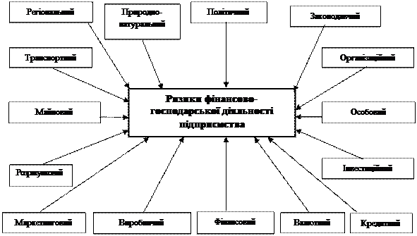 2 Оцінка ризиків фінансово-господарської діяльності підприємств на етапі прийняття управлінського рішення В умовах ринкових відносин проблема оцінки ризиків фінансово-господарської діяльності підприємств набуває самостійного теоретичного і прикладного значення як важлива| складова частина теорії і практики управління. Даний розділ присвячений застосуванню на практиці комплексного методу оцінки ризику на етапі прийняття управлінського рішення. Підприємствам слід не уникати ризику, а вміти управляти ним. Одне з головних правил фінансово-господарської діяльності свідчить: “Не уникати ризику, а передбачати його, прагнучи знизити до найнижчого рівня”. Під ризиком слід розуміти наслідок дії або бездіяльності, внаслідок якої існує реальна можливість отримання невизначених результатів різного характеру, як позитивних, так і таких, що негативно впливають на фінансово-господарську діяльність підприємства. Перш за все при аналізі діяльності компанії важлива класифікація ризиків. Вимоги до класифікації ризиків можуть бути зведені до наступного. По-перше, в даній класифікації не повинно бути видів і підвидів ризику, тобто не можна групувати ризики в певні групи. Це може бути тільки “віртуальним” об'єднанням. Інакше може відбутися “розмивання” ризику, тобто зменшення його значущості, і, як наслідок, неправильне дослідження і оцінка. По-друге, кожен ризик повинен визначатися і оцінюватися окремо, і чим точніше визначається ризик, тим легше його оцінити. По-третє, пропонована класифікація не є жорсткою. Кожен керівник при здійсненні фінансово-господарської діяльності може сам доповнювати приведений перелік ризиків. Пропонована класифікація ризиків представлена на мал. 2.1.
