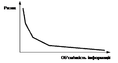 Рис.2.2. Блок-схема комплексної оцінки ризиків 2.2 Здобуття і обробка інформації Інформація — це сукупність нових відомостей про навколишній світ. Вимоги, що пред'являються до якості інформації, на наш погляд, повинні бути наступними: · достовірність (коректність) інформації — міра наближеності інформації до першоджерела або точність передачі інформації; · об'єктивність інформації — міра відображення інформацією реальності; однозначність; · порядок інформації — кількість передавальних ланок між першоджерелом і кінцевим користувачем; · повнота інформації — відображення вичерпного характеру відповідності отриманих відомостей цілям збору; · релевантність — ступінь наближення інформації до суті питання або ступінь відповідності інформації поставленому завданню; · актуальність інформації (значущість) — важливість інформації для оцінки ризику; вартість інформації. Пропонується встановити взаємозв'язок між ризиком і якістю інформації, по якій йде його (ризику) оцінка. Висловлюється припущення, що ймовірність ризику прийняття неякісного (збиткового) рішення залежить від якості і об'єму використовуваної інформації. Це припущення узяте з неокласичної теорії ризику. Згідно даної теорії, за наявності декількох варіантів прийняття рішення (при рівній прибутковості) вибирається таке рішення, при якому вірогідність ризику (коливання) найменша. Можна припустити, що також за наявності декількох варіантів з однаковим прибутком вибирається таке рішення, яке засноване на якіснішій інформації, тобто існує зв'язок між ризиком і інформацією. На рис. 2.3. показана передбачувана залежність ймовірність ризику прийняття неякісного (збиткового) рішення і об'єму /якості інформації.