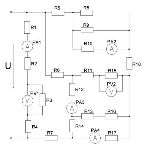 Для электрической цепи постоянного тока, электрические параметры элементов которой заданы в таблице: 4.1. Методом эквивалентных преобразований определить токи In и напряжения Un во всех ветвях схемы, Rэкв - эквивалентное сопротивление всей цепи (Ом); I0 - общий ток цепи (А); P - мощность всей цепи (Вт); IPA1 - показания 1-го амперметра (А); IPA2 - показания 2-го амперметра (А); UPV1 - показания вольтметра (В); Результаты расчетов свести в таблицу. 4.2. Произвести проверку расчетов, составив баланс мощности. 4.3. Считая напряжение источника питания неизменным, путем логических рассуждений пояснить, как изменяется показания всех приборов в цепи при увеличении сопротивления большего по значению резистора из заданных.