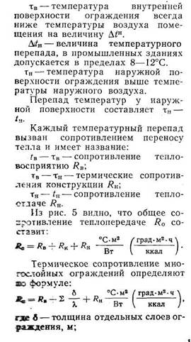 Стены, покрытия и другие конструкции отапливаемых промышленных зданий в теплотехническом отношении должны: препятствовать прохождению через них тепла, т. е. обладать достаточными теплозащитными свойствами: сохранять на внутренней поверхности ограждения температуру, не допускающую образования конденсата (капель воды выпадающих из воздуха); иметь достаточную теплоустойчивость, т. е. сохранять относительно постоянную температуру на внутренней поверхности ограждения при колебаниях наружных и внутренних температур; препятствовать прониканию воздуха в помещение; сохранять постоянную влажность, обеспечивая нормальный влажностный режим в помещении и долговечность ограждения. При переходе тепла через ограждение (рис. 5) наблюдается падение температуры от Д, До tH, обусловленное термическим сопротивлением конструкции.