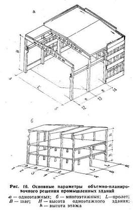 Основными объемно-планировочными параметрами здания (рис. 10) являются: пролет, т. е. расстояние между разбивочными осями продольных рядов колонн или стен; шаг, т. е. расстояние между разбивочными осями поперечных рялоз колонн или стен; высота, т. е. расстояние от уровня пола до низа несущей конструкции покрытия (в одноэтажных зданиях) или расстояние между уровнями чистых полов (в многоэтажных зданиях). Совокупность расстояний между колоннами в продольном и поперечном направлении называют сеткой колонн. Единство технических решений при проектировании промышленных зданий основано на унификации объемно-планировочных параметров. Это достигается ограничением числа размеров пролетов, шагов, высот этажей и величиной нагрузок на типовые конструкции. Основными положениями по унификации предусмотрены следующие параметры одноэтажных промышленных зданий: пролеты 12, 18, 24, 36 м и т. д. (через 6 м); шаг колонн 6 и 12 м; высота 6; 7,2; 8,4; 9,6; 10,8; 12; 13,2; 14,4; 15,6; 16,8 и 18 м (кратно 1,2 м). В многоэтажных зданиях размеры параметров следующие: пролеты 6,9; 12 м; шаг колонн 6 м; высота этажей 3,3; 3,6; 4,2; 4,8; 6 м; полезные нагрузки на перекрытие: до 25 кН/м2 (при сетке колонн 6Х Х6 м), до 15 кН/м2 (при сетке колонн 9X6 м). Ограничение числа параметров объемно-планировочного решения снижает затраты на проектирование и изготовление сборных конструкций и ежегодно экономит до 200 млн. руб.