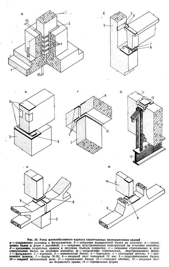 Места сопряжений разнотипных элементов сборного каркаса называют узлами. Узлы железобетонных каркасов должны удовлетворять требованиям прочности, жесткости и долговечности; неизменяемости сопрягаемых элементов при действии монтажных и эксплуатационных нагрузок; несложности при монтаже и заделке. Узлы сборного железобетонного каркаса классифицируют: По характеру статической работы: жесткие (рамные), воспринимающие изгибающие моменты, продольные и поперечные силы; шарнирные, воспринимающие только продольные силы и препятствующие смещению элементов при действии поперечных сил. По условиям восприятия нагрузки: расчетные, воспринимающие нагрузки; нерасчетные, не воспринимающие нагрузок. По способу заделки: монолитные, заделанные бетоном; сборные, соединяемые с помощью болтов и сварки; сборно-монолитные, сочетающие сварку закладных деталей или выпусков арматуры с последующим замоноличиванием стыка. Для сборных железобетонных каркасов характерны следующие узлы. Сопряжение колонны с фундаментом (рис. 39,а). Глубина заделки колонн прямоугольного сечения 0,85 м, двухветвевого 1,2 м. Стыкза-моноличивают бетоном марки не ниже 200. Бороздки на гранях колонны способствуют лучшему сцеплению бетона в полости стыка. Опирание подкрановой балки на выступы или консоли колонны (рис. 39,6). К опорам балки (до ее установки) приваривают стальной лист с вырезами для анкерных болтов. На опорах колонны балку закрепляют к анкерным болтам и приваривают закладные детали. Верхнюю полку подкрановой балки закрепляют стальными планками, приваренными к закладным деталям. Сопряжение стропильных ферм и балок с колонной (рис. 39,<?). К опорам стропильных конструкций приваривают стальные листы. После установки и выверки опорные листы стропильных конструкций приваривают к закладным деталям на оголовке колонны. Опирание подстропильных конструкций на оголовке колонны (рис. 39,г). Закладные детали стыкуемых элементов сваривают потолочным швом. Крепление подвесных кранов (рис. 39,(?) к конструкциям покрытия. Несущие балки кранов закрепляют болтами к стальным обоймам на строительных конструкциях. Перекидные балки (рис. 40) нагрузку от подвесных кранов перераспределяют между узлами стропильных ферм. Сопряжение стропильных и подстропильных элементов (рис. 39,е, ж) аналогично креплению ферм и балок на оголовке колонны.