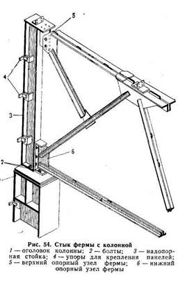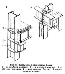 Узлами стального каркаса называют сопряжение его разнотипных элементов, например, колонн и ферм, осуществляемое на болтах с последующей монтажной сваркой. Основные узлы каркаса: опирание колонн на фундамент (см. рис. 44). Конструкция этого узла подробно рассмотрена в § 43; опирание подкрановых балок на консоли или выступы колонн (рис. 53) нижней строганой кромкой опорных ребер, которые соединяются между собой болтами. Верхнюю часть балок закрепляют стальными планками, приваренными к колоннам;