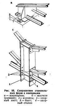 сопряжение стропильных ферм с колоннами (рис. 54) выполняют шарнирным. К надопорной стойке, закрепленной на оголовке колонны, прикрепляют болтами верхний и нижний пояс ферм. Опоры треугольных ферм (рис. 55,а) к оголовкам колонн закрепляются анкерными болтами. При рамном (жестком) сопряжении ферм с колоннами (рис. 55,6) опорные фасонки верхнего и нижнего пояса фермы к стволу колонны закрепляются болтами, а кромка нижней фасонки опирается на приваренный монтажный столик; сопряжение подстропильных ферм на оголовке колонны (рис. 56,6). Нижний пояс фермы примыкает к надопорной стойке из сварного двутавра и крепится к ней болтами: сопряжение стропильной фермы с подстропильной (рис. 56,в)осуществляют на опорном столике нижнего пояса.