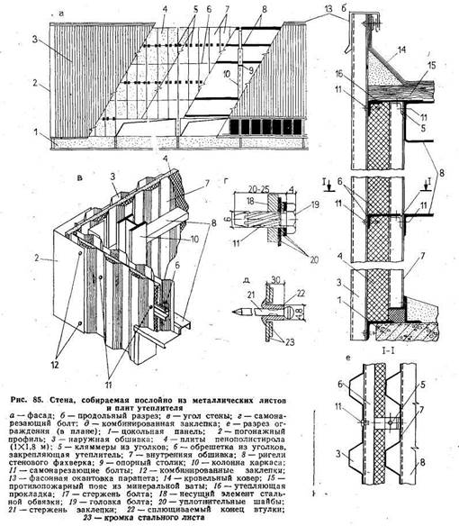 Стены из металлических листов с эффективным утеплителем устраивают в одноэтажных промышленных зданиях при влажности воздуха в помещении до 60%- Цоколь таких стен выполняют из легкобетонных панелей или кирпича. Вышележащие участки стен, выполненные из профилированного листа, закрепляют к горизонтальным ригелям стенового фахверка. По конструктивному решению металлические стены различают: послойно собираемые из стальных листов и плит утеплителя; монтируемые из укрупненных панелей, изготовленных на строительной площадке; монтируемые из панелей заводского изготовления. Стены полистовой сборки (рис. 85) состоят из горизонтальных ригелей, обшивки из профилированных листов и пенополистирольных плит утеплителя. При возведении