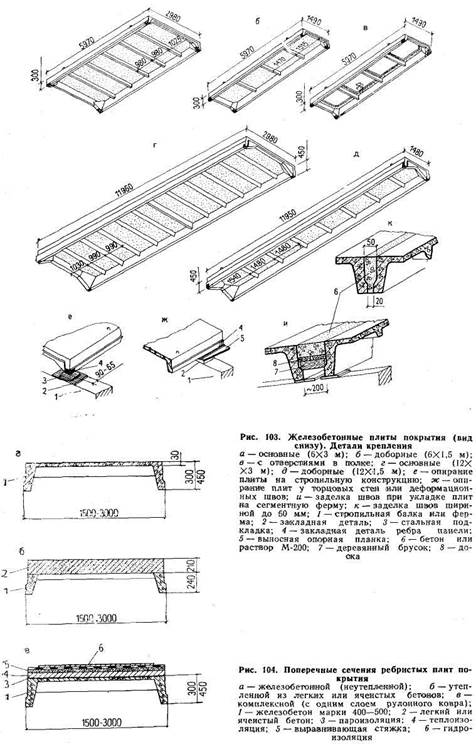 Покрытия зданий массового строительства выполняют из железобетонных предварительно напряженных панелей (рис. 103). Крупноразмерные панели укладывают по верхнему поясу стропильных балок или ферм. При шаге несущих конструкций 6 м используют плиты 6X3 и 6Х Xl,5 м, при шаге 12 м плиты 12Х ХЗ и 12X1,5 м. В местах пропуска вентиляционных шахт, расположения зенитных фонарей и участков 1легкосбра'сываемого покрытия укладываются плиты с отверстиями в полке. Панели шириной 1,5 м предназначены для участков с большими нагрузками (в местах «снеговых мешков», перепада высот, у фонарей) или используются в качестве доборных элементов. Ребра 12-метровых плит (рис. 103,е, ж) опирают на железобетонные или стальные балки на длину не менее 90 мм, а шестиметровых — соответственно на длину не менее