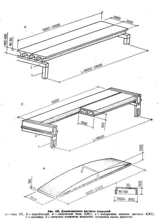 75 и 65 мм. Закладные детали плит приваривают к стропильным конструкциям не менее чем в трех точках. Швы между уложенными плитами (рис. 103,/с и и) заделывают бетоном марки 200, а при опирании плит на сегментные фермы в шов закладывают доску, затем стык замоноличивают бетоном. Железобетонные плиты покрытия (рис. 104) изготовляют: неутепленными, требующими укладки пароизоляции, теплоизоляции и гидроизоляции в построечных условиях; утепленными из легких ил» ячеистых бетонов, совмещающие функции настила и утеплителя; комплексными, имеющими слой утеплителя и гидроизоляции; в построечных условиях заделывают швы и наклеивают кровлю. Длинномерные настилы покрытий (рис. 105) опирают на балки, уложенные по колоннам продольных рядов (вдоль пролета). При неплохих технико-экономических показателях они применяются пока в экспериментальном строительстве. Date: 2015-07-24; view: 711; Нарушение авторских прав |