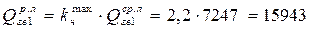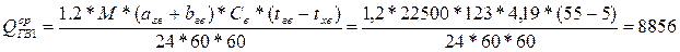 где - агв= 98 л/сут · чел - общая норма расхода воды (одним потребителем) в средние сутки (смену) (принимаем по [1]); - bгв = 25 л/сут · чел - норма расхода горячей воды на одного человека, работающего в общественном, административно-бытовом или производственном здании при отсутствии точных данных; - M=22500 чел - количество потребителей воды, проживающих и работающих в микрорайоне; - tхв = 5 ºС - температура холодной воды у водоразборных приборов зданий; - tгв = 55 ºС- температура горячей воды у водоразборных приборов зданий(принимаем равной 60 ºС так как нет точных данных) - СВ = 4,19 кДж/(кг· ºС) -теплоемкость воды.