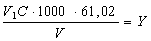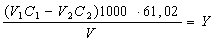 де V1 — об'єм розчину соляної кислоти, добавлений до проби води, см3; С1 — концентрація розчину соляної кислоти, добавленої до проби води, моль-екв/дм3; V2 — об'єм стандартного розчину бури, витрачений на титрування залишку соляної кислоти, см3; С2 — концентрація стандартного розчину бури, витраченого на титрування залишку соляної кислоти, моль-екв/дм3; V— об'єм проби води, см; 61,02 — молярна маса еквівалента гідрокарбонат-іонів.