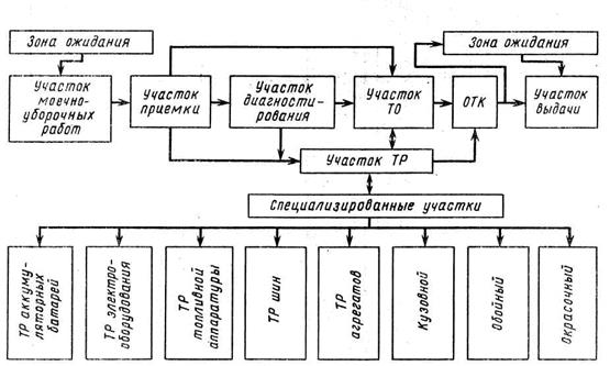 Технологическим процессом выполнения технического обслуживания и ремонта автомобилей называется определенная последовательность работ, обеспечивающая высокое качество их выполнения при минимальных затратах. В основу организации технологического процесса положена единая функциональная схема: автомобили, прибывающие на СТО для проведения ТО и ремонта, проходят участок уборочно-моечных работ и поступают далее на участки приемки, диагностирования, ТО и ТР (рисунок 1).