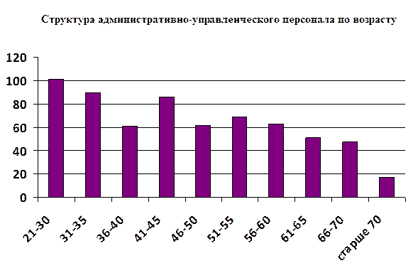 Рис. 2 Структура административно-управленческого персонала по возрасту Анализируя структуру административно-управленческого персонала по возрасту, можно сделать вывод, что группы персонала с 21-30, 31-35, 41-45 лет имеют наибольшую численность. Группы персонала с 36-40, 46-50, 51-55, 56-60, 61-65, 66-70 лет имеют примерно равное значение. Наименьшую долю в структуре административно-управленческого персонала по возрасту занимает группа старше 70 лет. Проявляющееся нелинейное распределение в структуре административно-управленческого персонала по возрасту объясняется различной политикой Университета относительно найма административно-управленческого персонала, а также демографической ситуацией в регионе.