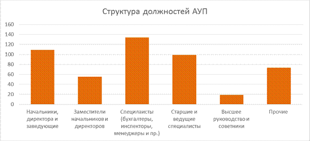 Рис. 3. Структура должностей административно-управленческого персонала Рис. 3 иллюстрирует, что в структуре должностей административно-управленческого персонала преобладают специалисты и старшие/ведущие специалисты, что объясняется ориентацией на исполнение базовых задач. На каждых двух сотрудников из группы «Начальники, директора и заведующие» приходится в среднем один сотрудник из группы «Заместители начальников и директоров». Анализ системы управления персоналом в организации (матрица анализа системы управления персоналом в Приложении А ) Функции по управлению персоналом исполняет Управление развития персонала, которое является структурным подразделением Томского государственного университета. Данное подразделение было создано в 2014 году, когда в рамках второй стратегической инициативы «Привлечение и развитие ключевого персонала вуза, рост качества исследовательского и профессорско-преподавательского состава («Кадры новой формации»)» было создано Управление развития человеческих ресурсов, которое затем было переименовано в Управление развития персонала. Целью деятельности управления развития персонала является создание условий для привлечения, постоянного развития работников и вовлечения их в реализацию стратегии ТГУ. На данный момент базовые процессы системы управления персоналом являются не выстроенными и неполными. В системе отсутствует важный элемент – разработка стратегии управления персоналом и кадровой политики. Функции подбора и оценки персонала осуществляются формально, что неприемлемо для происходящего процесса трансформации в соответствии с Дорожной картой. Для процесса адаптации персонала разработано «Положение об адаптации работников Томского государственного университета», но оно еще не вступило в силу. Также введена новая система стимулирования на основе эффективных контрактов, и на данный момент осуществляется разработка системы ключевых показателей эффективности, которые призваны приблизить деятельность персонала к выполнению стратегической цели Университета. В прошлом году в соответствии со второй стратегической инициативой «Привлечение и развитие ключевого персонала вуза, рост качества исследовательского и профессорско-преподавательского состава («Кадры новой формации»)» стартовал проект «Кадровый резерв», в рамках которого уже прошел первый набор и запланированные мероприятия. Положение по управлению проектом «Кадровый резерв» находится в разработке, так как не определены критерии оценки кандидатов на входе и выходе, процесс от вхождения до выпуска из кадрового резерва является не систематизированным. Обучение и развитие персонала также является актуальным направлением управления. Исторически Университет занимался обучением научно-педагогического и профессорско- преподавательского состава. На данном этапе, когда университет движется по вектору развития, необходима профессионализация административно-управленческого персонала. В обучении персонала актуализируется проблема построения системы управления обучением всех групп персонала, в том числе административно-управленческого, т.к. изменение стратегических целей Университета требует изменения и наращивая новых компетенций, соответствующих проектируемой ситуации развития. Для управлен
