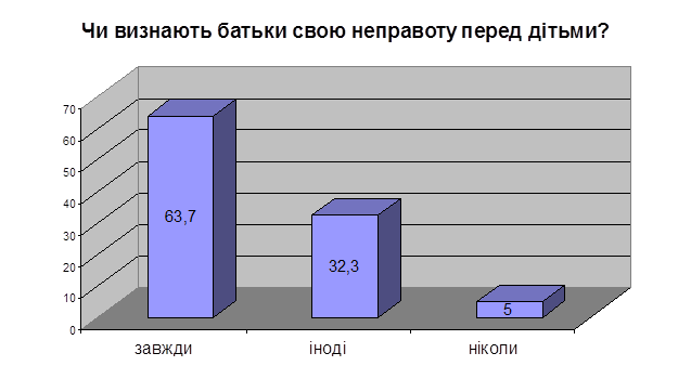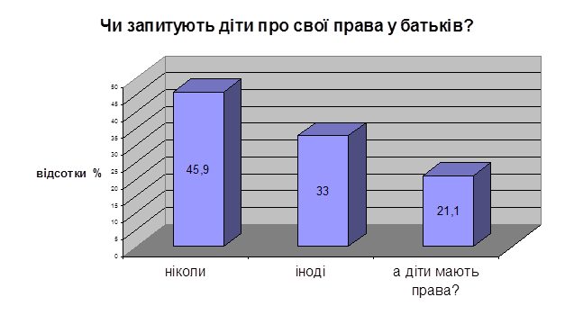 Сьогодні вже не достатньо просто змінювати світ в інтересах дітей, сьогодні вже йде мова про те, щоб змінювати світ разом з дітьми. Для цього треба слухати, що кажуть молоді люди, треба надавати їм можливість висловлювати свою думку і брати участь у прийнятті рішень, що торкаються їх життя. Настав час перейти від доброчинності стосовно дітей до визнання того, що дитина, як і кожна людина, має власні права. Особливу увагу також слід приділяти думці батьків, бо це вони першими повинні укладати грунт правової свідомості у психологію дитини. У жовтні минулого року Центр “Соціальний моніторинг” за підтримки Представництва ЮНІСЕФ в Україні провів соціологічне опитування дітей у віці від 9-17 років та їхніх батьків. Опитування проводилось у 106 населених пунктах України. Відповіді дали 5221 батьків. Результати виявилися дуже цікавими. Ось деякі з них: